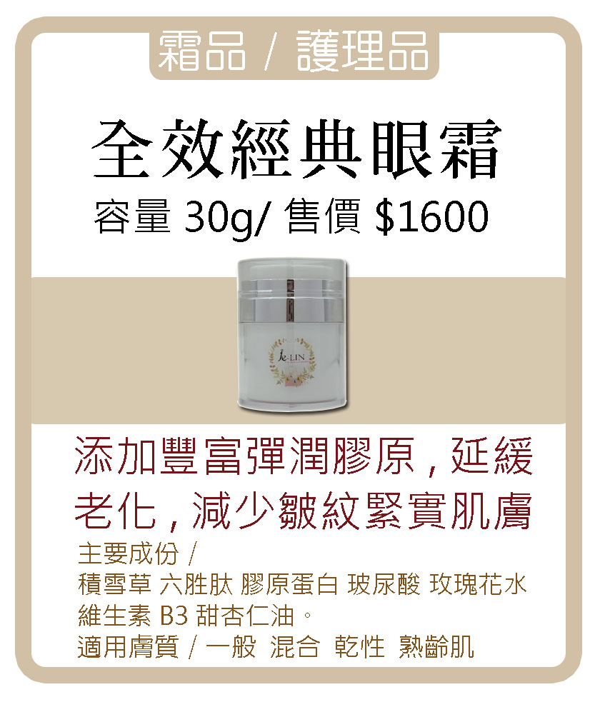 說明:添加豐富骨膠原,延緩老化,減少皺紋緊實肌膚。主要成份:維他命A醇衍生物、海藻萃取、膠原蛋白、維生素E、胜肽。適用膚質:一般.混合.乾性.熟齡肌