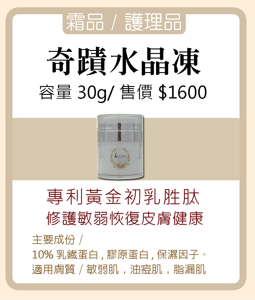 說明:專利黃金初乳胜肽 修護敏弱恢復皮膚健康主要成份:10%乳鐡蛋白、膠原蛋白、保濕因子。適用膚質:敏弱肌、油痘肌、脂漏肌