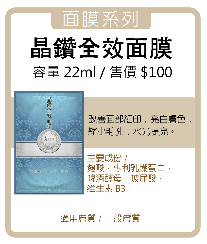 說明:加速肌膚修護,術後專用。快速舒緩雷射術後不適。敏弱肌膚,恢復健康。主要成份:歐可靈、甜沒藥、洋甘菊萃取、玻尿酸鈉、尿囊素、甘草精。適用膚質:一般膚質